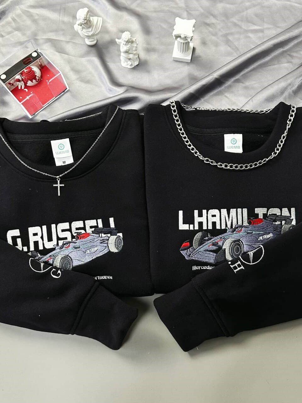 Formula 1 Russell & Hamilton Çift Nakış Işleme Örme Sweatshirt.