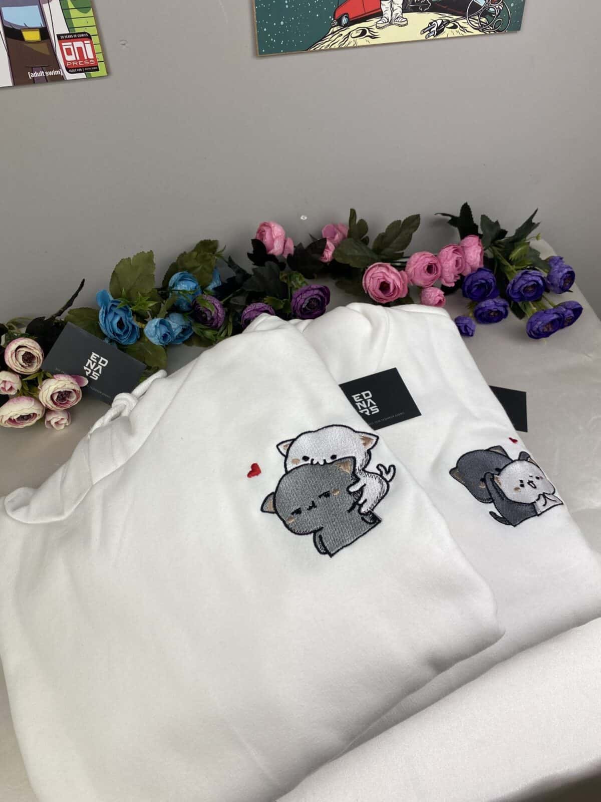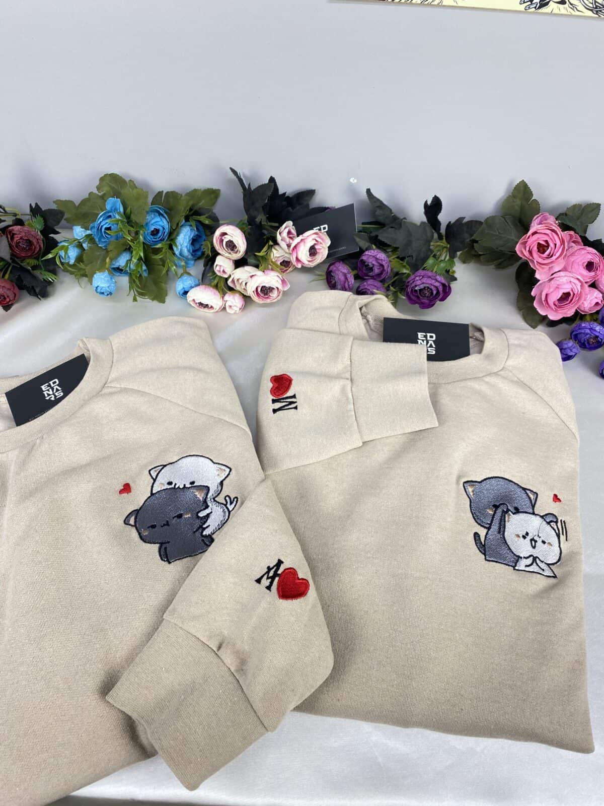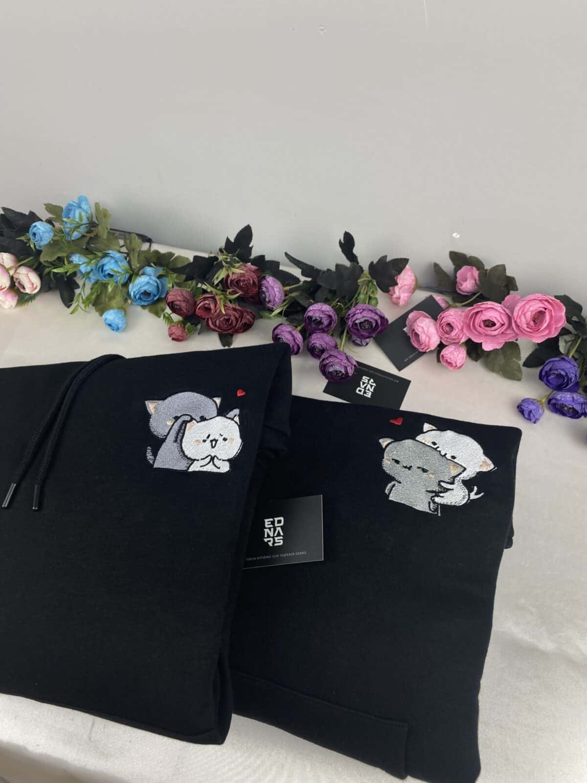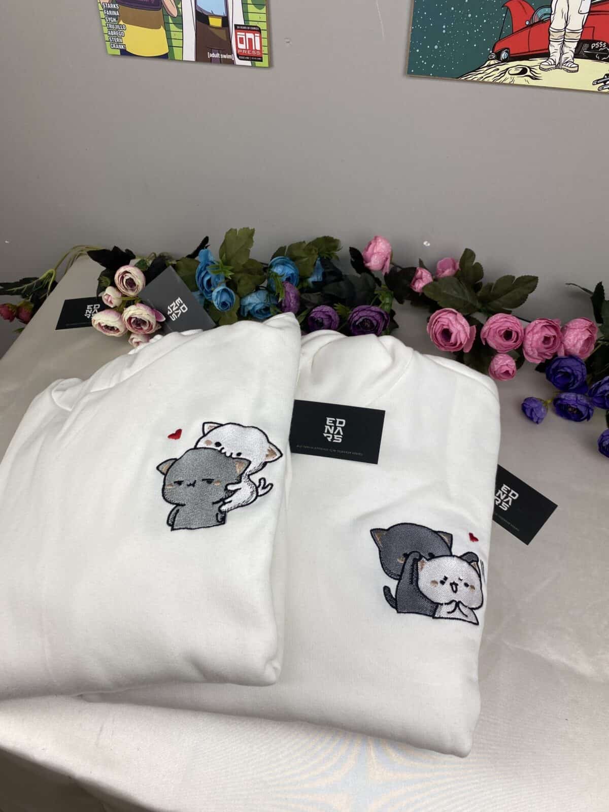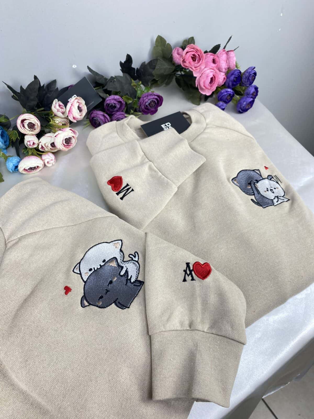 Sevimli Kediler Çift Nakış Işleme Örme Sweatshirt.